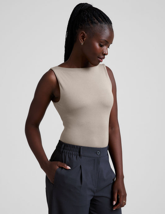 Stylish Eclipse Open Back Tank Top, Comfortable Built-in Shelf Bra, Fitted Design